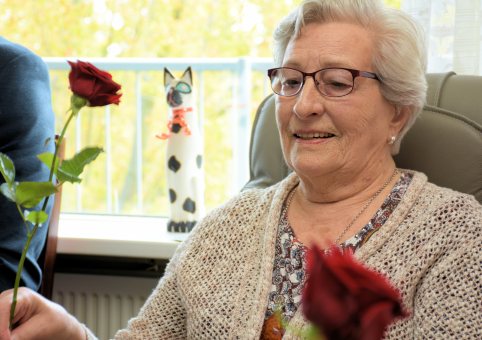 Ze werd 88 afgelopen maandag en had zondag haar hele familie op de koffie om het te vieren.  En ze wist van niets. Ze vond het niet raar dat de bank opzij werd geschoven en dat dochterlief wat zenuwachtig heen en weer drentelde tussen de keuken, de slaapkamer (onze kleedkamer) en de woonkamer. Ze zag de rozen niet staan in de gang en verbaasde zich niet over de hoeveelheid taart die op de tafel stond. Ze hoorde het vervaarlijke gepiep van onze naar binnen gesmokkelde serveerwagen niet boven het geroezemoes uit en zag de nieuwsgierige blikken van haar kroost niet in de richting van de gang, waar wij onze opwachting maakten.