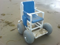 Als we de strandtent uitlopen staan er vlakbij de deur twee strandrolstoelen met grote rubber banden klaar. We dollen er even mee. Ilonka gaat er in zitten en ik rijd hem een stukje het strand op, in het mulle zand.