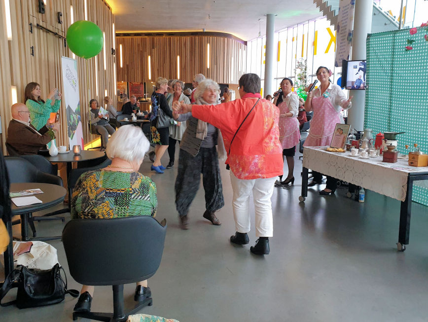 ‘Het doel is om in meer gemeenten aandacht te vragen voor de oudere doelgroep en het positieve effect van kunst en cultuur op hun welbevinden. Dat ouderen zich blijven ontwikkelen (fysiek, mentaal) door een inspirerend aanbod van professionele kunstenaars en zo wellicht meer zelfvertrouwen opbouwen wat hun zelfredzaamheid vergroot’, schreef een van de organisatoren. Mooie raakvlakken met het werk van de Zingende Koffiemeisjes.