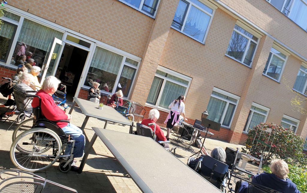 We vinden een door bouwhekken omgeven tuintje, dat grenst aan de straat en aan een huiskamer. We stellen onze spullen op in de prachtige voorjaarszon. Het wordt een heerlijk uurtje. De bewoners worden naar buiten in de zon gereden en aan de overzijde, op de eerste verdieping, voor het raam gezet. Wij mogen ze blij zingen en wat voelen we ons dankbaar. Ze zitten op een grotere afstand dan we gewend zijn en het is lastig voor ons om niet naar ze toe te gaan als ze een traan laten of met hun handen zwaaien. Een bewoner voedt een andere een dropje. Onderling is er geen afstand.